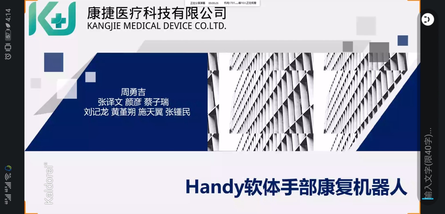 “应用于电商前置库内外的智能物联箱以及同城共享众包运输平台”小组对产品的环保和智能化平台的优势进行着重讲解,获得了评委的一致好评。“智能养老多功能助行器”小组从当今的社会养老问题展开,旨在帮助老人解决在室内行动障碍的问题。“Handy软体手部康复机器人”小组则是把目标人群定位在了残障人士身上,通过形象的图片,阐述了本产品的安全便携的特性。最后一个小组介绍的产品是金枪鱼削皮器,选手表示希望通过此类产品可以将海鲜产品加工流水线变得更加智能。答辩结束后评委老师针对产品的优势、实施的可能性等方面与选手们进行交流。