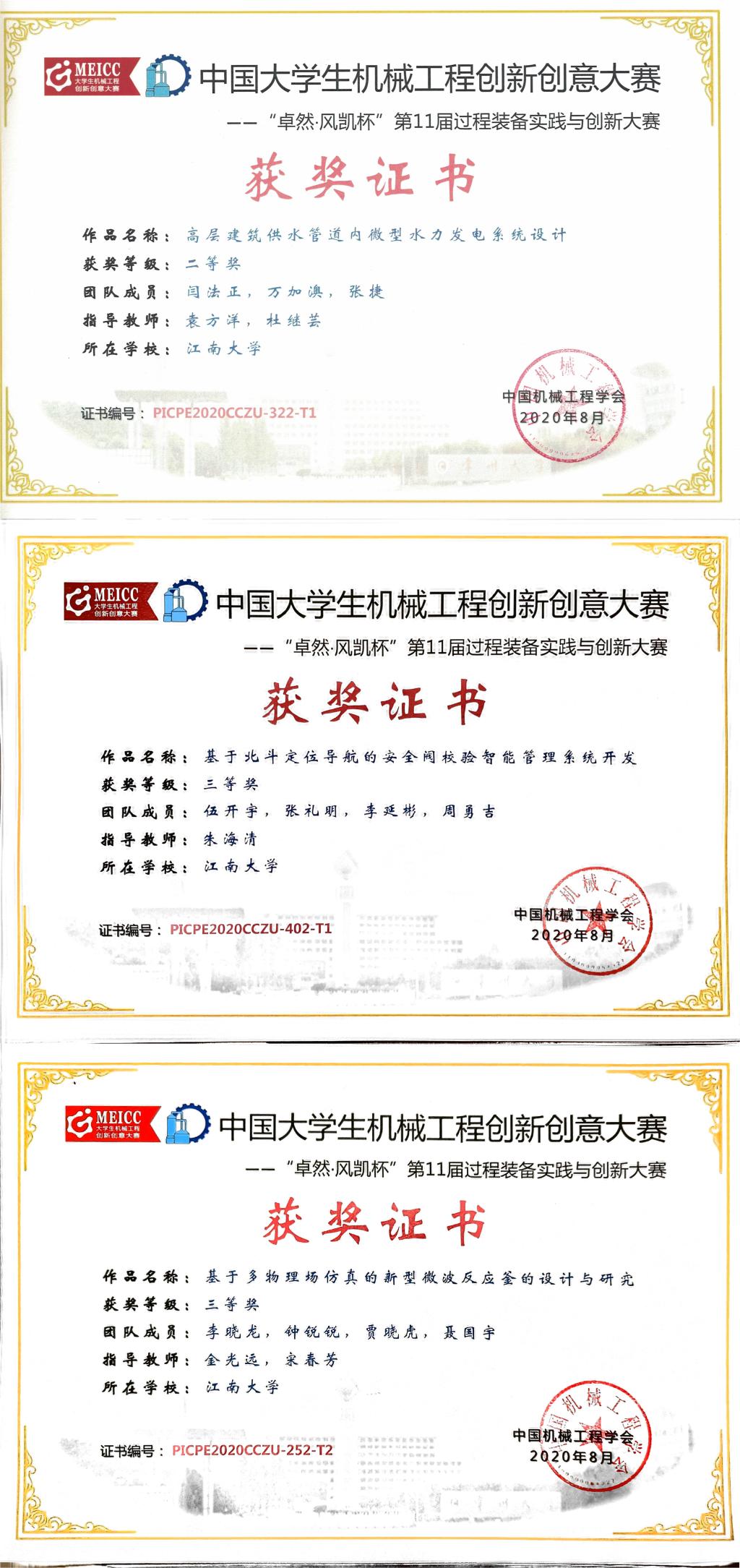 袁方洋、杜继芸老师指导课题“高层建筑供水管道内微型水力发电系统设计”获得了“卓然·风凯杯”第十一届过程装备实践与创新大赛二等奖,参赛员工:闫法正、万加澳、张捷;金光远、宋春芳指导课题“基于多物理场仿真的新型微波反应釜的设计与研究”获得了三等奖,参赛员工:李晓龙、钟锐锐、贾晓虎、聂国宇;朱海清指导课题“基于北斗定位导航的安全阀校验智能管理系统开发”获得了三等奖,参赛员工:伍开宇、张礼明、李延彬、周勇吉。
