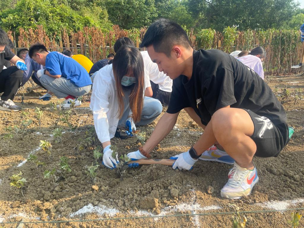 活动开始前,蒋凌羽向员工们介绍了小鼋花园的种植区域划分以及劳动实践教育意义。吴湘娟详细讲解艾草种植的注意事项,亲自示范如何铲土与种苗。讲解结束后,同学们自行组队拿起工具进行艾草苗种植。虽然天气炎热,但丝毫不影响同学们的干活热情与认真态度。他们根据老师的讲解,按照间距要求和苗坑深度,认真地将一棵棵艾草苗整齐种植好。参与此次活动的同学看到自己的劳动成果后都非常开心,有同学表示是第一次参加此类活动,感觉自己得到了与课程学习和科研实践不一样的收获与快乐。