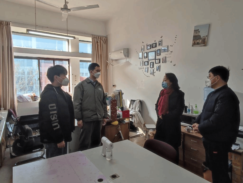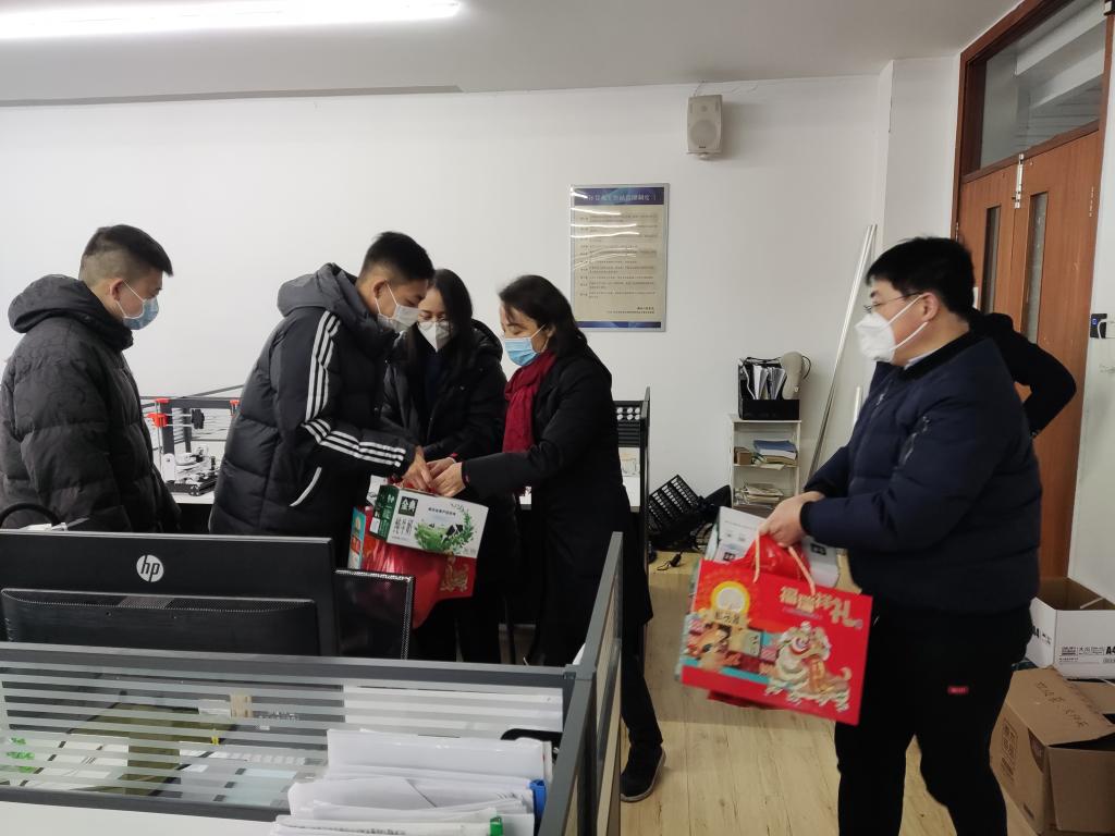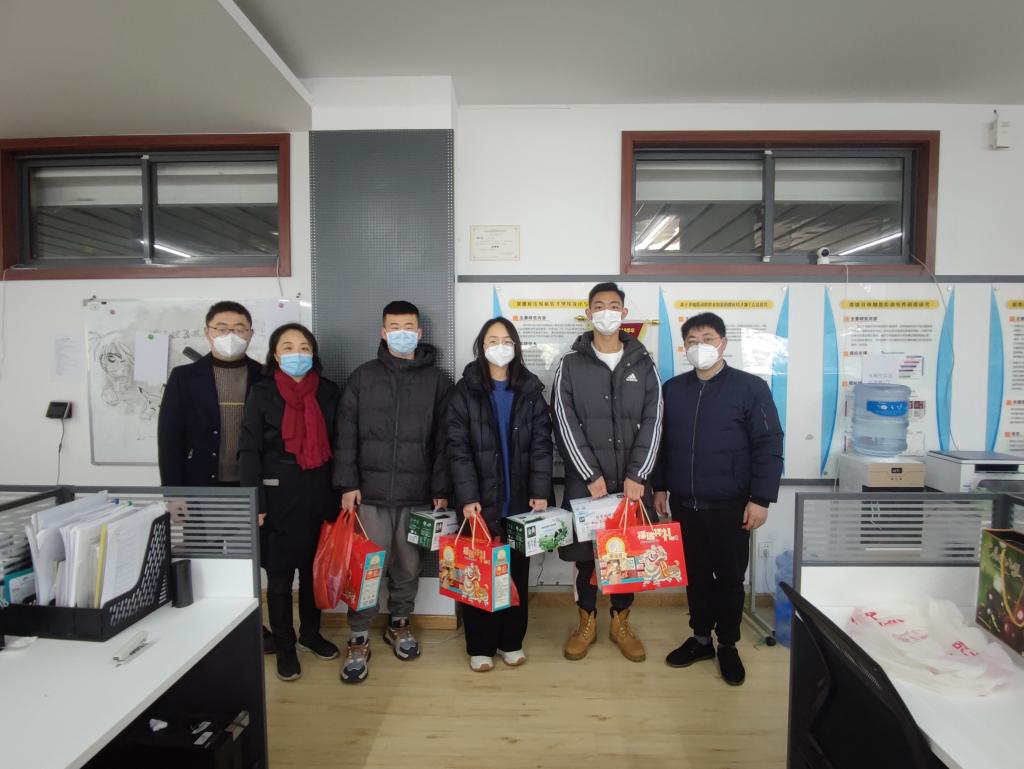 因科研等原因,假期留校员工包括12名硕士研究生、3名博士生。高雪梅带队走访员工工作室、实验室,亲切询问员工留校生活与科研情况,叮嘱员工在校期间注意安全,保持身心健康,学业上攻坚克难的同时不忘每天和父母电话、视频报平安。随后,老师们送上了新春礼盒、防疫物资、年午饭票及新春祝福。