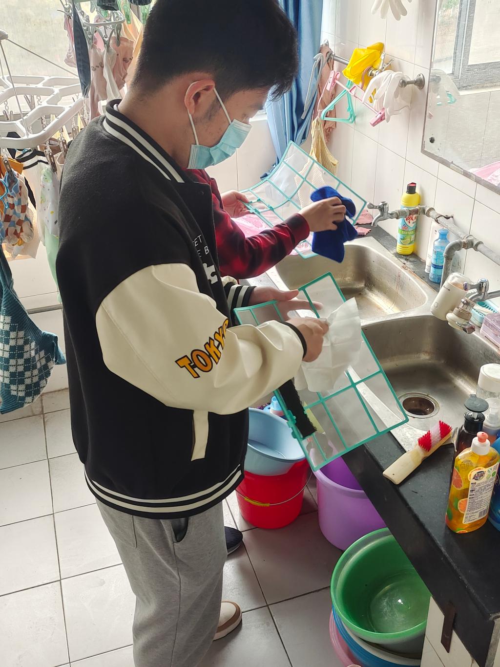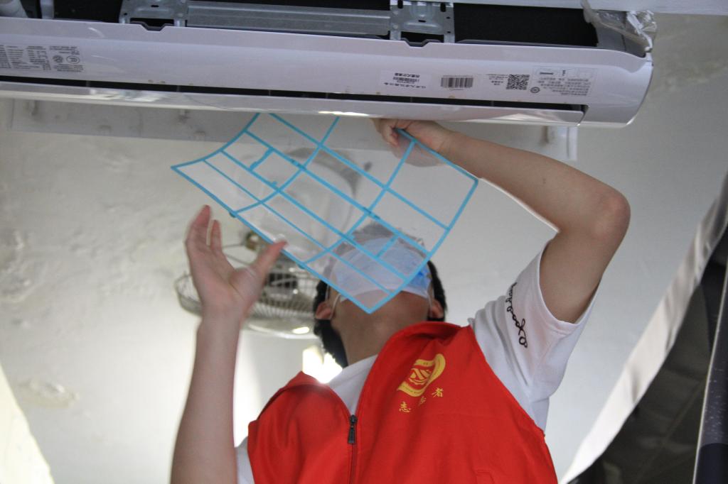 在志愿服务正式开展前,黄丽萍向同学们发放工具、示范空调滤网清洗的步骤,并对同学们积极参与园区志愿服务表示感谢。余骏皓为志愿者们进行分组、分楼层、分宿舍,叮嘱员工认真清洗的同时要注意安全。在所有志愿者的努力下,经过一下午的辛勤劳作,榴园16号楼82个寝室的空调过滤网均清洗干净,为还未到来的夏季酷暑提前做好了“降温”准备。