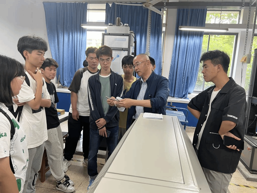 第三站,张能武、周文军老师带领员工走进材料力学性能检测实验室、先进制造实验室。老师们介绍了材料力学性能的检测设备及其在测量各种材料力学性能中的作用,各种机床的功能及其中涉及到的相关学科知识,并鼓励员工刻苦努力学习,打好坚实基础。