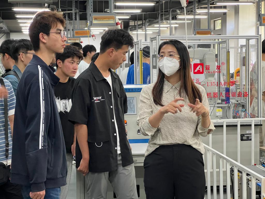 参观第一站来到了机器人包装及物流自动化实验室、机器人创新实践实验室、机器人编程控制实验室、PLC自动化综合实验室。员工通过李挺、左文娟老师的详细介绍,了解了机器人的结构与运行,并通过与多种类机器人的互动,进一步明晰专业发展现状及应用前景。