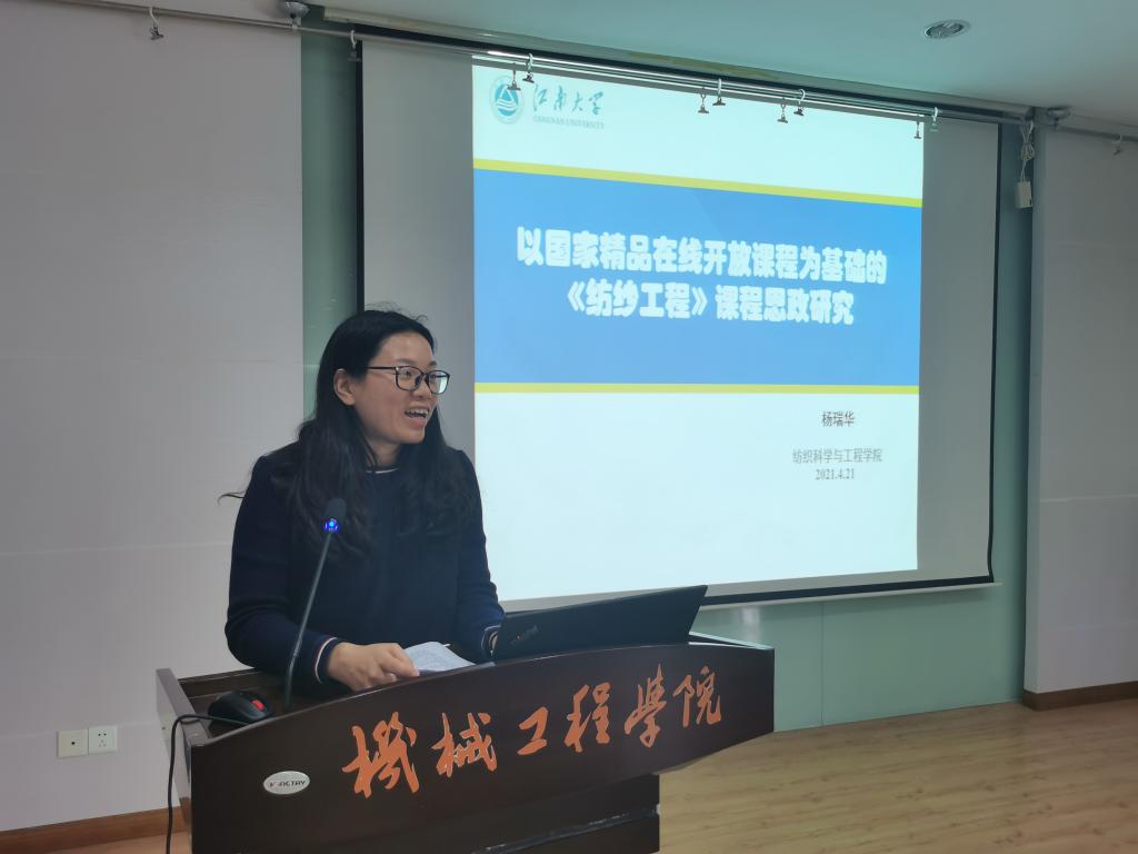 接着,纺织科学与工程公司杨瑞华老师应邀作了题为《以国家精品在线开放课程为基础的纺纱工程课程思政研究》的报告,以国家精品在线开放课程《纺纱工程》为例,与大家进行了经验分享:一是通过修改教学大纲,将课程思政列入培养目标;发掘思政元素,构建包含哲学、爱国、爱专业、做人和做事的《纺纱工程》思政教学体系。二是以思政教学体系为指导,国家精品在线开放课程 《纺纱工程》为平台,实施线上下紧密结合的SPOC和翻转课堂教学形式;探索程思政的情景新模式。三是建立纺纱工程课思政系列案例,逐步形成库和微视频集锦。四是建立课程思政具体考核量化方法。