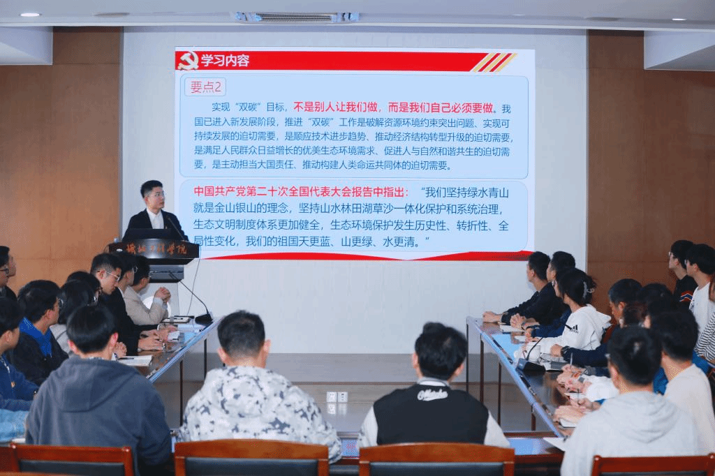 首先是理论学习。与会同志进行了《习近平谈治国理政》第四卷中《实现“双碳”目标是一场广泛而深刻的变革》的原文学习。官俊和受邀前来的教师党支部书记纪小刚教授、员工党员崔辰晖进行了领学。官俊结合党的二十大报告中关于生态文明建设的部分论述,领学了“实现碳达峰、碳中和目标的重要意义”部分内容;纪小刚领学了“实现‘双碳’目标需提高战略思维能力,处理好发展与减排、整体和局部、长远目标与短期目标、政府和市场四对关系”部分内容,并结合国家新能源产业布局、公司学科发展前景进行交流分享;崔辰晖领学了“国家推动实现‘双碳’目标的具体政策,包括加强统筹协调、推动能源革命、推进产业优化升级、加快绿色低碳科技革命、完善绿色低碳政策体系、积极参与和引领全球气候治理六个方面”部分内容。员工党员陆杨进行重点发言,说,通过今天的原文学习更加理解了实现“双碳”目标的重要意义,表示要努力培养创新精神,将所学专业知识应用到产业技术创新中,助力“双碳”目标的实现。员工党员方久康、牛云腾等进行了交流发言。