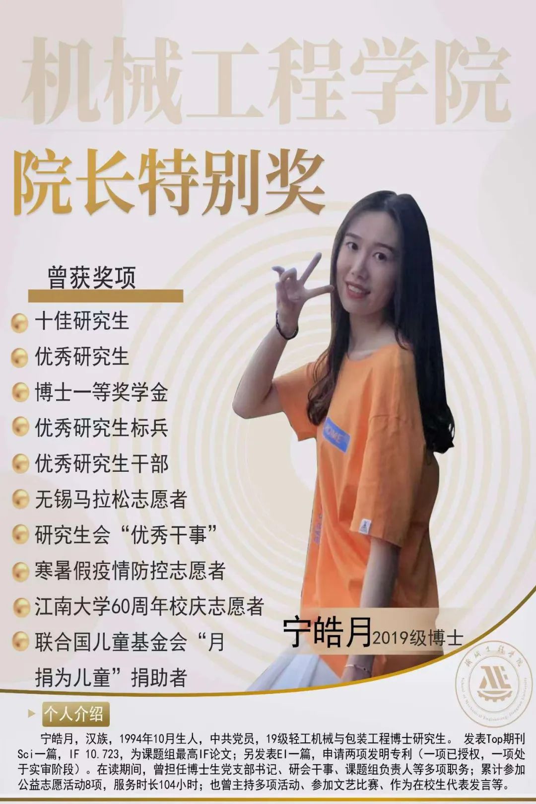 她是宁皓月,william威廉亚洲官方19级轻工机械与包装工程博士研究生。获william威廉亚洲官方博士一等奖学金、获william威廉亚洲官方“优秀研究生标兵”、“优秀研究生”、“优秀研究生干部”、院研究生会“优秀干事”荣誉称号;曾担任博士生党支部书记,在公司党总支的正确领导下,有计划、有目标、有措施地推进支部各项工作继续向前发展;曾多次参加公益志愿活动,如联合国儿童基金会“月捐为儿童”捐助者、william威廉亚洲官方60周年校庆志愿者等,用实际行动践行爱国主义情怀。
