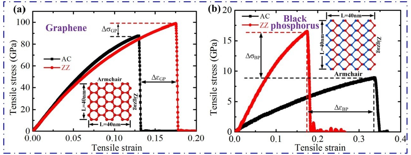 图1(a)石墨烯和(b)黑磷在缺陷调控下的力学各向异性
