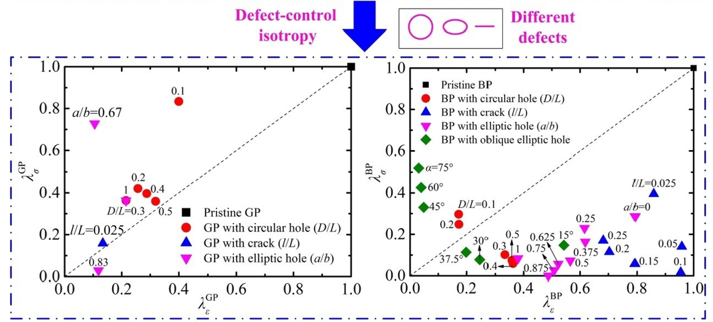 该论文首次采用分子动力学模拟证明了可以通过调控缺陷(圆孔、椭圆孔和裂纹)来改善二维材料—石墨烯和黑磷力学各向异性,并结合连续介质力学理论验证了模拟结果的准确性;同时还利用宏观拉伸实验测量了开孔复合薄膜材料的非线性力学特性,进一步证实了可利用缺陷调控二维材料的力学各向异性。这一研究不仅对揭示缺陷调控机制的起源具有重要的物理意义,还为该调控手段提供了理论和实验支持。