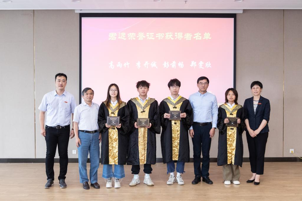 紧接着,李可致辞。他充分肯定了同学们在大学四年从本科课本知识到科创比赛中所取得的不菲成绩,也对同学们提出了“守正笃实,久久为功”“踔厉奋发,勇毅前行”“敢为人先,追求卓越”三点期望。最后他暖心提出君远公司永远是毕业学子的坚强后盾,并祝福同学们前程似锦。随后,嘉宾为获得君远荣誉证书、君远单项奖学金、君远卓越奖学金、君远卓越奖教金等获奖师生颁发证书并合影留念。