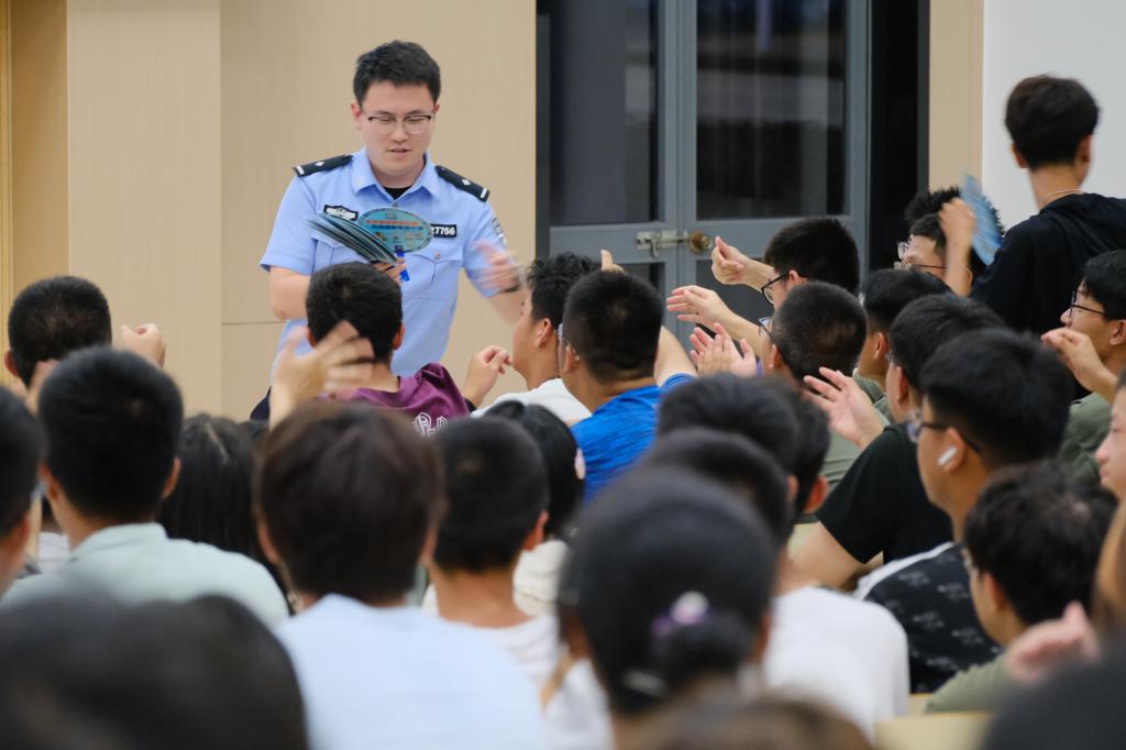 讲座现场,杨恺凭借丰富的办案经验和专业的反诈知识,向新生们介绍了电信诈骗的惯用手段与常见形式。他以近几年发生的校园受骗案件为切入点分享了网购退款、游戏装备交易、线下交易以及刷单这四类高频案件实例,深入浅出地分析了目前员工受网络诈骗的心理特征与严峻形势及诈骗团伙花样百出的诈骗手法。警官生动的讲述及互动交流帮助新生切实提高了反诈意识与应对能力。