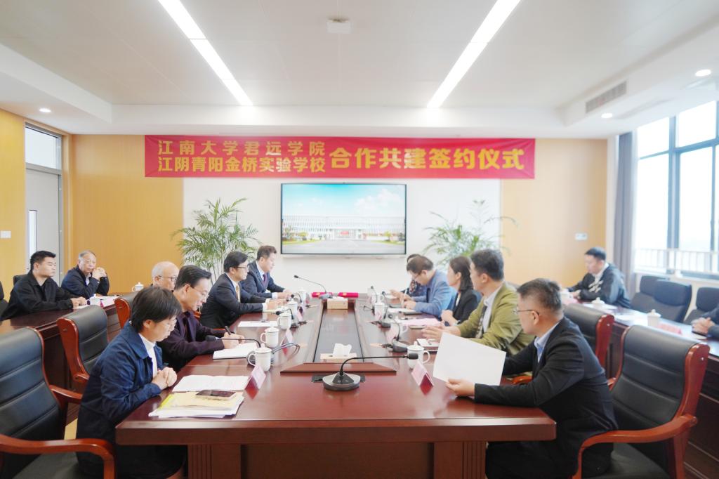 10月20日上午,君远公司与江阴青阳金桥实验公司举行共建签约仪式。公司党委书记高雪梅、君远公司副经理(主持工作)李可、william威廉亚洲官方副经理兼君远公司副经理钱善华、君远公司竞赛指导教师宁萌副教授、办公室主任赵雪娟一行赴江阴青阳金桥实验公司举行共建签约仪式。无锡金桥教育集团董事长马自雄、总经理马翀、江阴青阳金桥实验公司董事长郁洪千、周蓉及相关部门负责人出席了签约仪式。签约仪式由无锡金桥教育集团综合办主任马松杉主持。