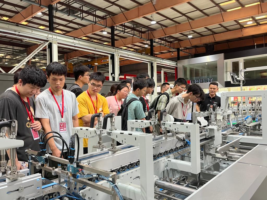 随后举行了2023年度博斯特奖学金的颁奖仪式。获奖者薛雨诗表达了对公司设立科创竞赛的感谢,并分享了自己在完成科创项目过程中的收获与成长。她表示这次参与公司出题的科创竞赛,是将所学理论知识运用到实践的有意尝试。组队参加的方式也更好地培养了团队合作意识,拓展了机械创新设计的新视角。颁奖仪式后,师生一行共同参观了公司的展厅和工作车间,现场观摩学习智能制造领域的前沿技术与先进装备。工作人员细心讲解并演示了机器生产原理,从纸板进料、折叠、胶装到装箱一气呵成,转眼间一张张纸片变成了精美的包装盒。在公司技术人员的讲解下,同学们发现复杂机器的设计其实就是课堂所学基本原理的实际应用,现场教学加深了同学们对机械原理的理解和认知。