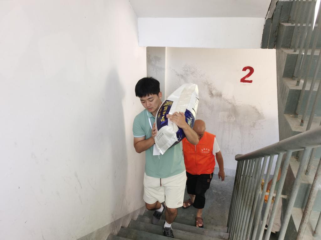 实践团队加入到瑞星社区的基层一线工作中,成员们不怕辛苦,主动担当,在高温天气下行走在小区各楼梯间,将大米与食用油一点一点搬到各个楼层,随后逐一分发给各户人家。