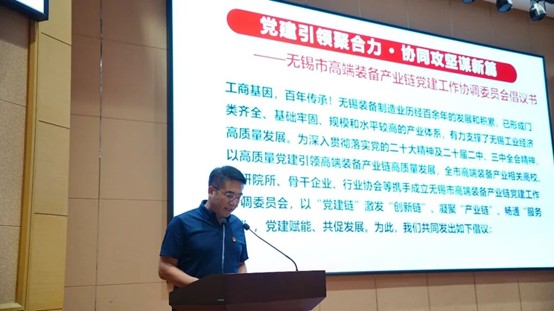 市委组织部组织三处副处长陈磊、市工业和信息化局装备与消费品产业处处长祁建伟共同为“无锡市高端装备产业链党建工作协调委员会”揭牌。华中科技大学无锡研究院副经理浦栋麟代表秘书长单位为无锡市高端装备产业链党建工作委员会副主任单位授牌。华中科技大学无锡研究院副经理王立成宣读了《无锡市高端装备产业链党建工作协调委员会倡议书》。