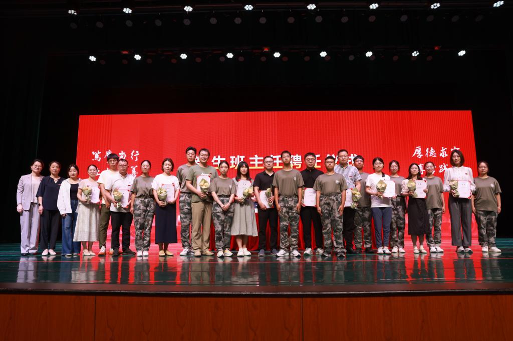 典礼期间举行了2025级新生班主任聘任仪式。党委书记高雪梅为班主任颁发聘书,员工代表向老师献花并合影留念。