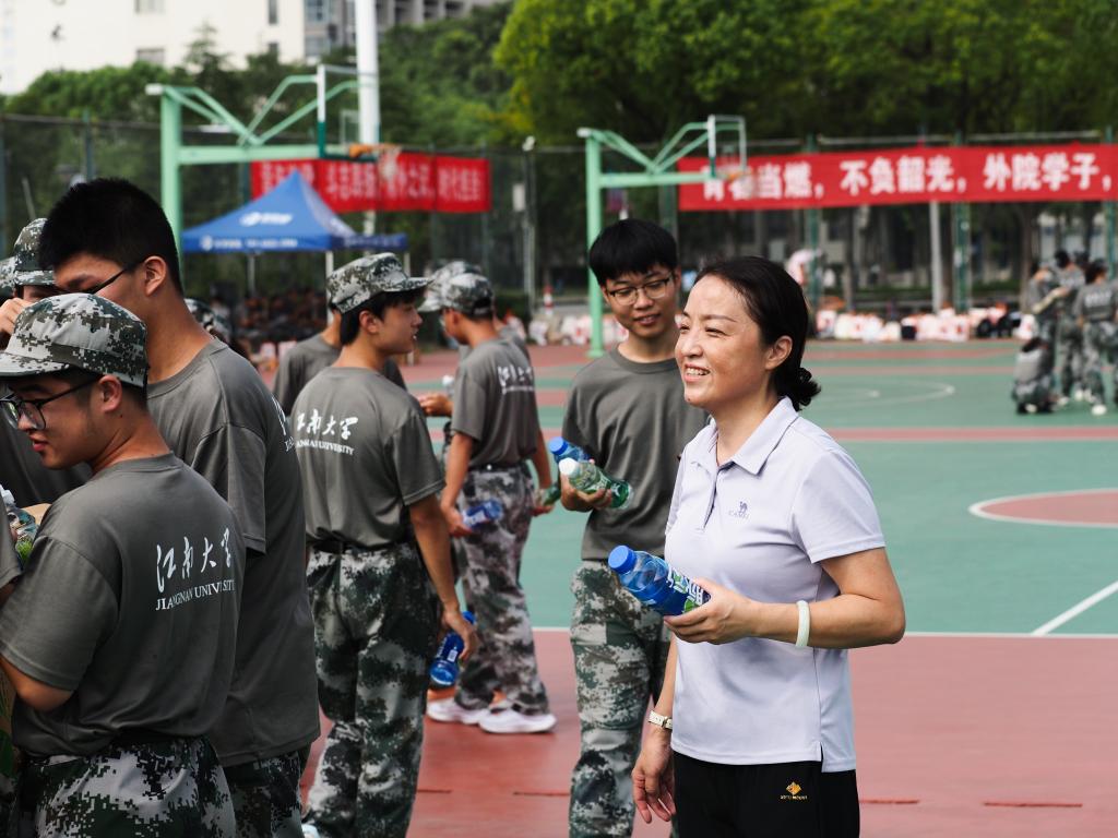 训练场上,同学们步伐铿锵、口号响亮,以整齐的队列和饱满的精神状态展示了多天以来的训练成果。公司老师们为同学们送上了解暑饮料和补给物品。一箱箱清凉、一句句问候,凝聚着公司的暖心关怀,也拉近了师生之间的距离。同学们也用热烈的掌声向带训教官、领导老师们表达感谢,迷彩映衬笑颜,训练场上温情流动。